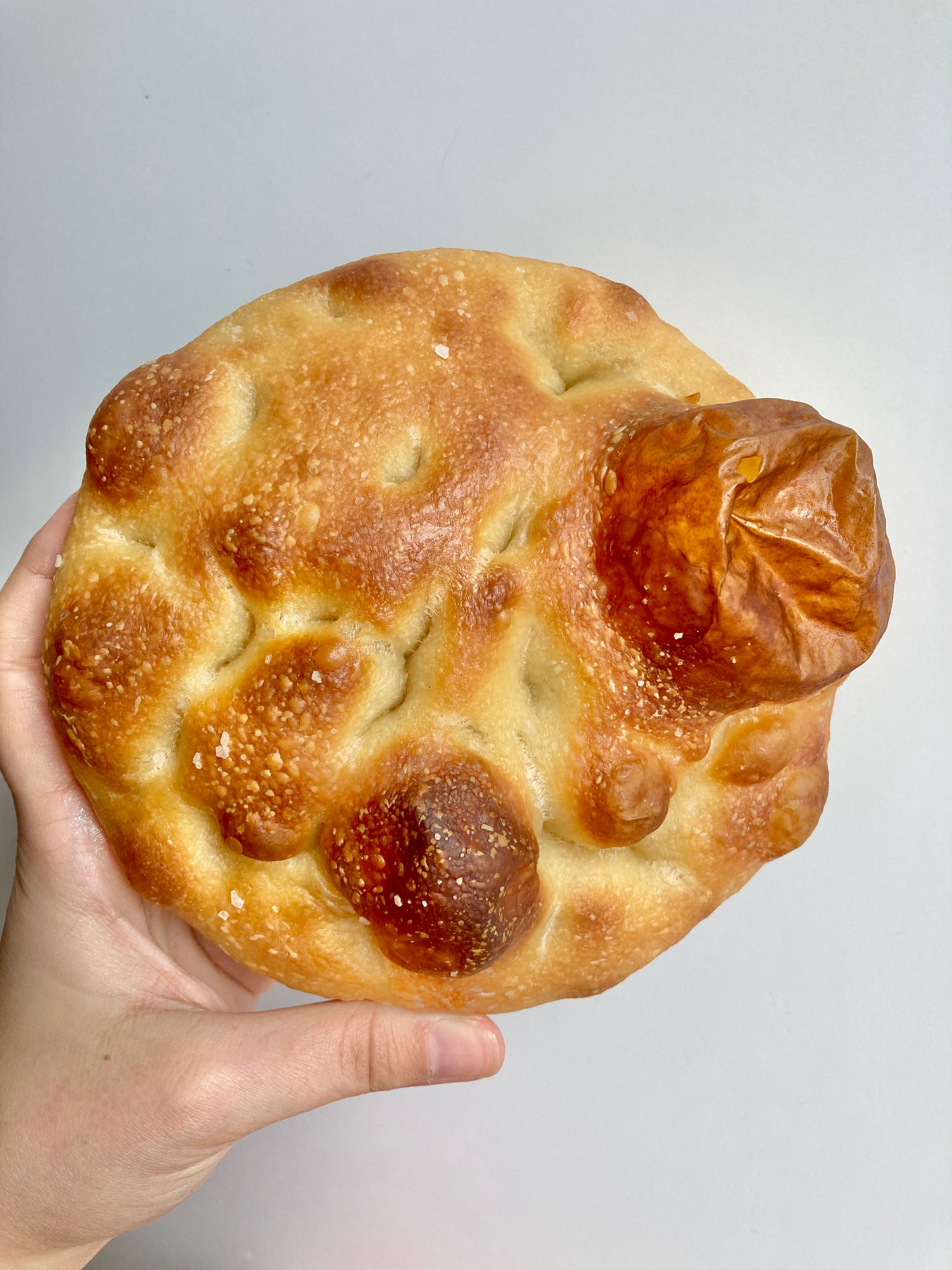Keep frozen focaccia in freezer. Do not thaw prior to cooking. Remove the plastic packaging and wrap tightly in tin foil. Preheat the oven or toaster oven to 400 and bake the focaccia for 25-27 minutes. Remove the foil and check that the bread is heated through. Toast for a few additional minutes to achieve desired color.